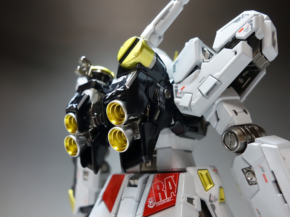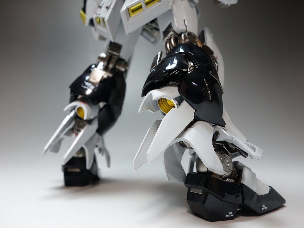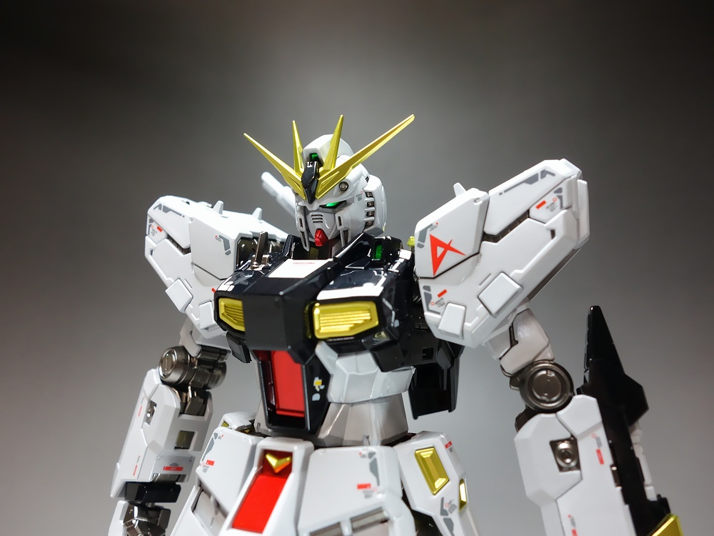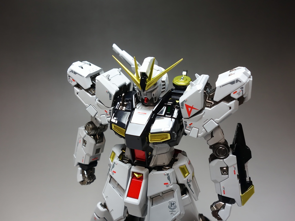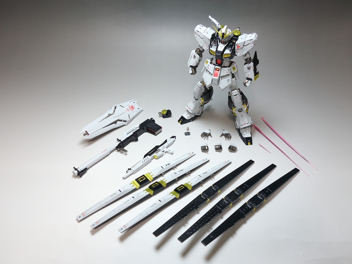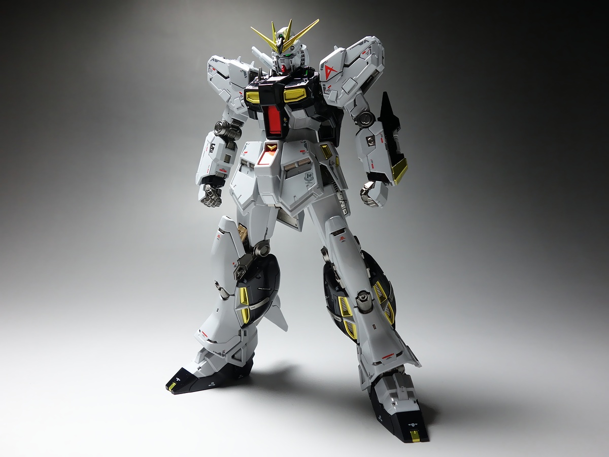 当店が考案した独自の塗装技法では、ゲート処理後にパーツ単位に塗装を行うので、通常の塗装パーツのようにゲート跡の成形色が見えたりする事がありません。RG 1/144 νガンダム と RG 1/144 Hi-νガンダム 2体のキットを使用(ニコイチ)して、マッシヴなνガンダムを製作しました。Hi-νガンダムのキット仕様の展開モード(発動モード)も再現可能です!